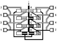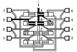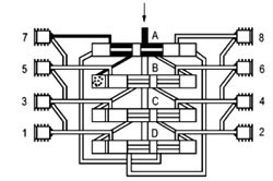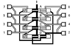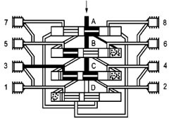 當(dāng)活塞D打通通向活塞A左側(cè)終端的連接通道后,潤滑劑流動(dòng)并將活塞A向右推動(dòng)。位于活塞A前右側(cè)的潤滑劑輸送到排出口1。